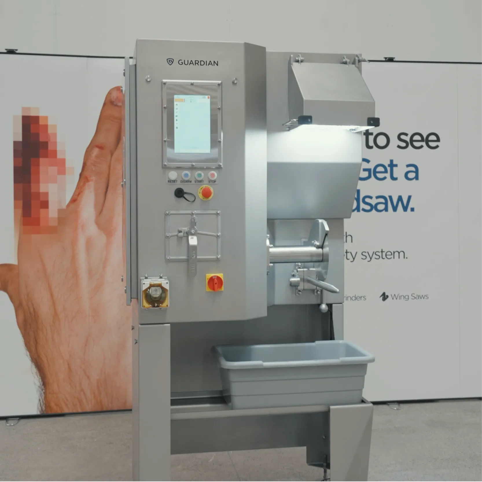 The Guardian Poultry Cutter combines 3D Vision Technology and contact sensing to prevent hand injuries during manual cutting. Traditional disk cutters expose operators to razor sharp blades—Guardian stops the blade before contact occurs.